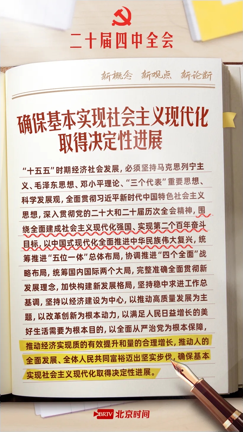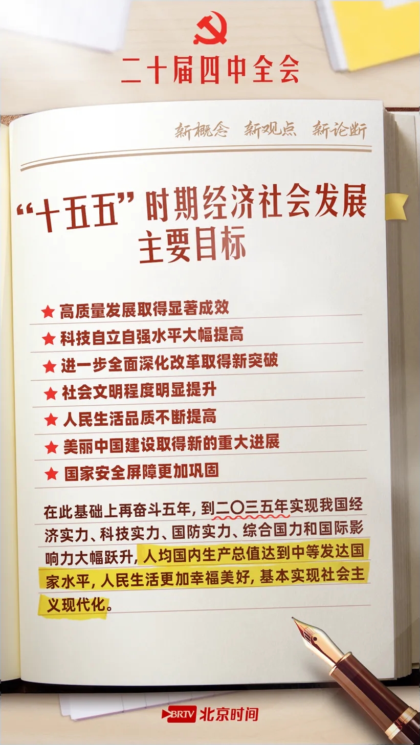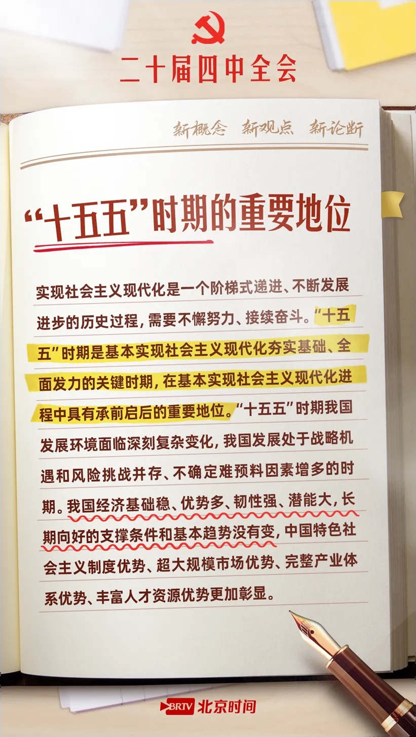 10月23日,党的二十届四中全会公报重磅发布,为“十五五”时期发展锚定航向,更向2035年基本实现社会主义现代化目标吹响号角。公报中提出了哪些新概念、新观点、新论断?“十五五”时期我国经济社会发展有哪些主要目标?收藏这份学习笔记,锚定目标,努力奋斗!