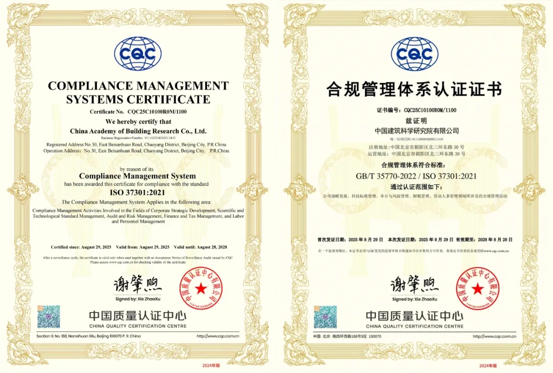近日,中国建研院成功通过中国质量认证中心(CQC)合规管理体系审核,获得国际标准ISO37301:2021和国家标准GB/T35770-2022认证证书,标志着公司在合规治理现代化进程中迈出坚实一步。